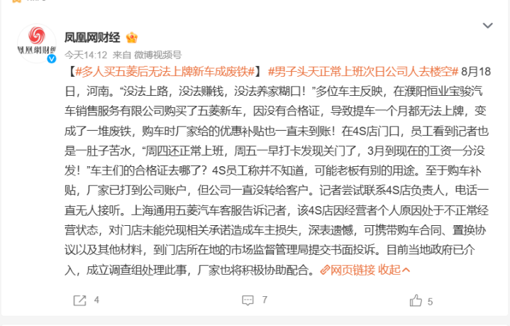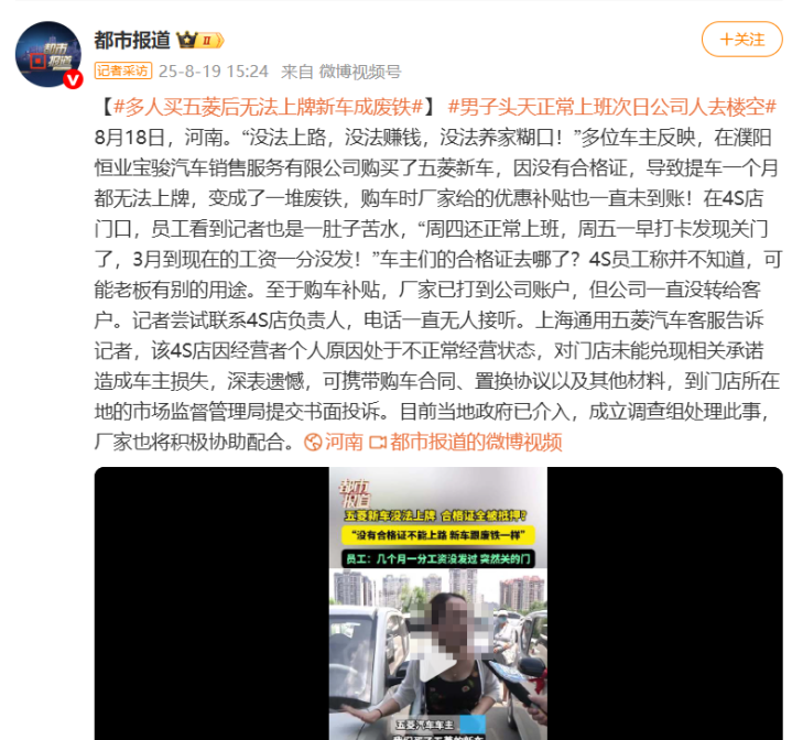 周四还在正常上班,周五一早来到公司却发现大门紧闭——这不仅是濮阳恒业宝骏汽车销售服务有限公司员工的遭遇,也成为了部分五菱车主的“烦心事”。提车一个月都无法上牌,因为4S店根本没有提供车辆合格证,新车可能瞬间变成“废铁”。
